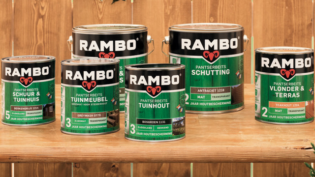 Voor schuren en tuinhuizen heeft Rambo een extra duurzame formule ontwikkeld. Deze beschermt langdurig tegen groene aanslag dankzij de Slow Release technologie. Daarnaast is deze beits elastisch en heeft het vermogen om mee te bewegen met de houtwerking. Hierdoor ontstaan geen scheurtjes in de beits.